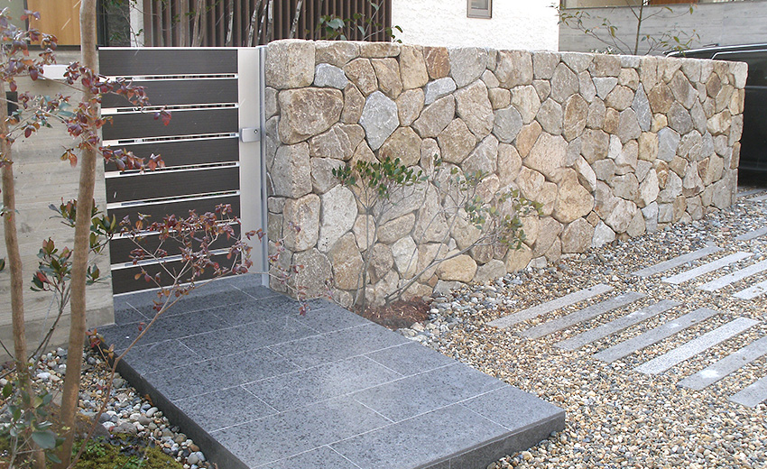 石積みの壁と杉板擁壁で自然に馴染む高級感ある外構