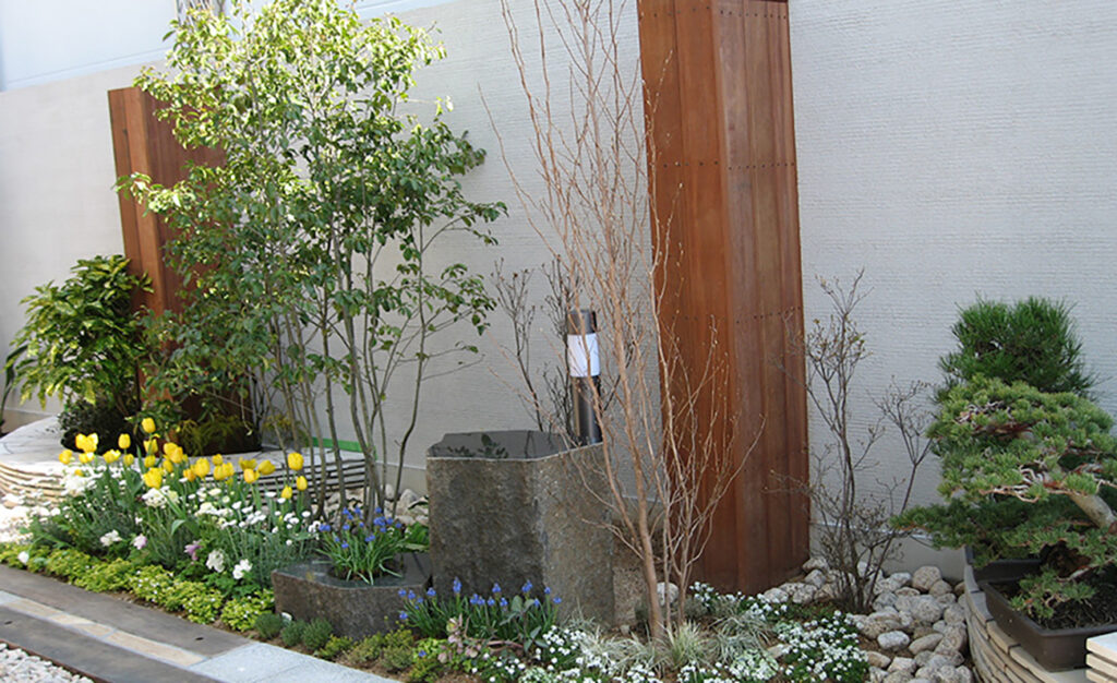 アプローチに乱石とピンコロを組み合わせ、動線に沿ってグリーンを配置しました。四季折々の植栽を楽しめるだけでなく、自然を感じられる外構に仕上げています。小物や素材選びにもこだわり、住まい全体に調和するエクステリアデザインとなりました。
