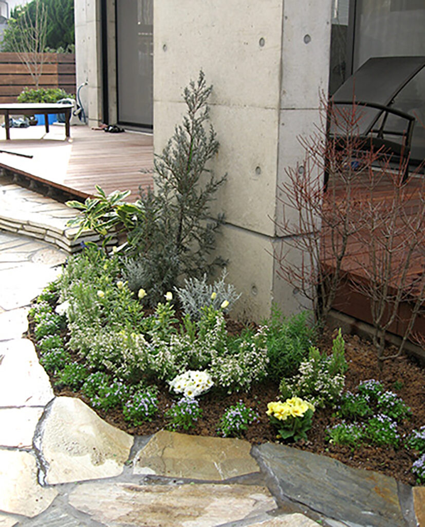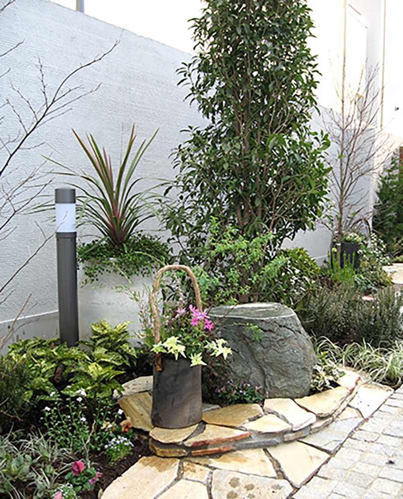 アプローチ施工(乱石・ピンコロ組合せ)、植栽工事、小物設置