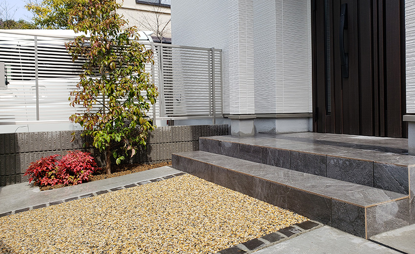 シャッターゲートを中心に、防犯性と高級感を両立したクローズ外構を設計。周囲のフェンスやサッシと色味を合わせたシャイングレーが全体に統一感をもたらします。門廻りは外壁に合わせた白い壁を採用し、木調タイルをアクセントに使用。門扉も木目調でまとめ、上質かつ温かみのある雰囲気に仕上げました。アプローチには樹脂舗装を使用し、明るく快適な印象を演出。道路面のフェンスには隙間隠しを加え、プライバシーをしっかり確保しています。