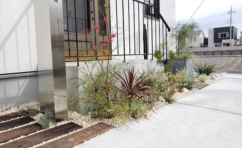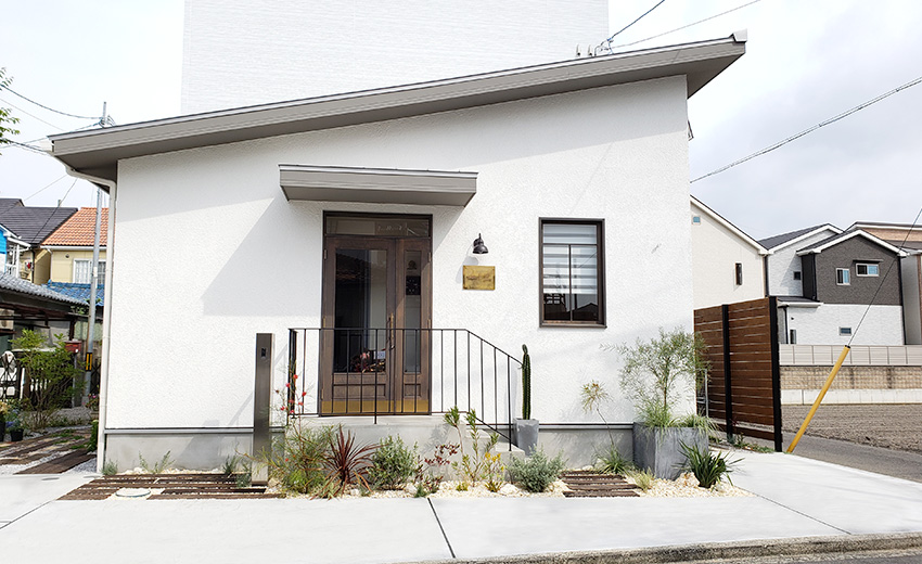 店舗を併設した住宅の外構工事を担当しました。シャビーな店舗外観に合わせ、風合いのある枕木をアクセントとして配置。看板や照明との相性も抜群で、全体に統一感のあるナチュラルな印象を与えています。お施主様ご自身が選ばれた植物が豊かに彩りを添え、見る人の心を惹きつける魅力的な空間に。デッキ下には室外機を隠す工夫を施し、排水処理も万全。フェンスの板張りはご主人様がDIYで施工され、温もりあるお庭が完成しました。アメリカンフェンスが全体を引き締め、こだわりの詰まった外構となっています。