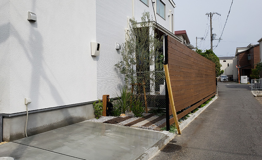 外構工事(門柱・フェンス・デッキ・アプローチ施工)、植栽設置