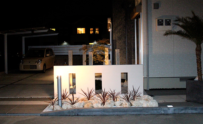 夜になると、門柱と植栽をやさしく照らすライトが幻想的な雰囲気を演出。植栽の影が壁や地面に映り込み、まるでアートのような陰影を生み出します。日中は緑が映える爽やかな空間、夜は照明による上質な趣を楽しめる二面性のあるデザイン。落ち着いた灯りが住まい全体にぬくもりを与え、家に帰る時間が楽しみになる外構に仕上げました。