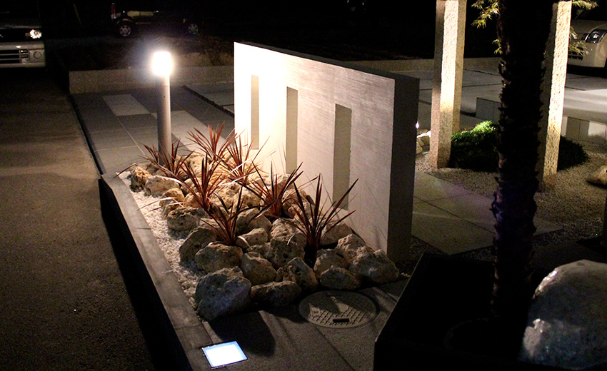 植栽と門柱を照らす穏やかな灯りが彩る