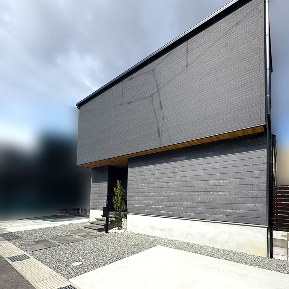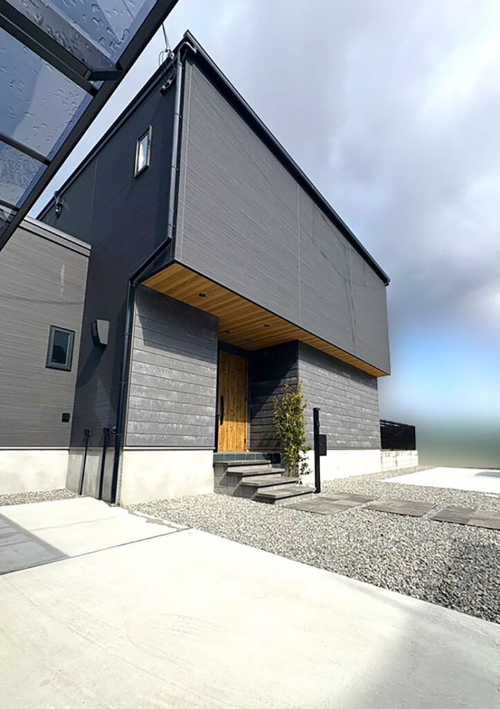 全体的にシンプルながらも、階段を浮き階段にし、階段とアプローチに同じ化粧平板を使用することで統一感のある外構に仕上げました。大きめの平板を採用したことで、上り下りの安心感も確保。さらに玄関ドア前には植栽を配置し、緑と足元の白いぐり石がアクセントとなり、落ち着きのある空間を演出しています。コンクリートは必要最低限の面積に抑え、コストダウンと全体のバランス向上を実現しました。