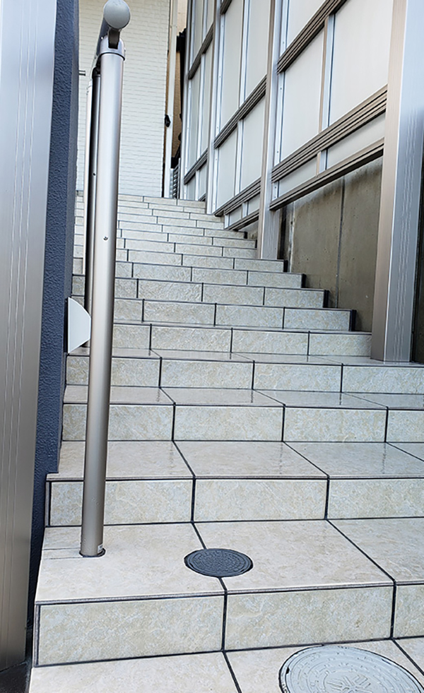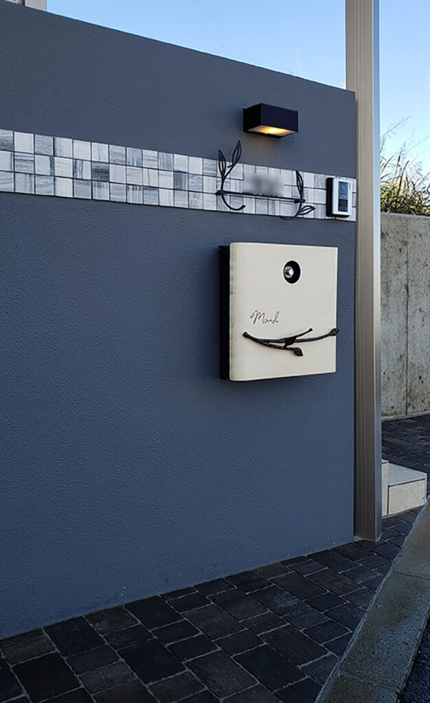 建物が白いご新居に合わせ、門まわりに濃い色を用いることで全体を引き締めた外構デザインに仕上げました。表札やポストにはアイアン素材を採用し、統一感と高級感を演出。ご高齢のご家族にも配慮し、階段は段差を通常より低く設定して緩やかに設計しています。さらに階段横に設置したフルオーダーパネルと2階テラスの屋根により、雨の日でも濡れずに玄関まで移動可能。玄関前のマスはハッチを活用することで、デザインを損なわず美しく仕上げています。