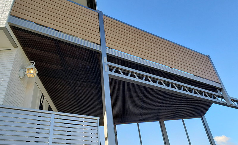 持ち出しテラス施工、人工樹脂ウッドデッキ材採用、波板設置(雨対策)、木目調フェンス設置、オーニング(日除け)設置