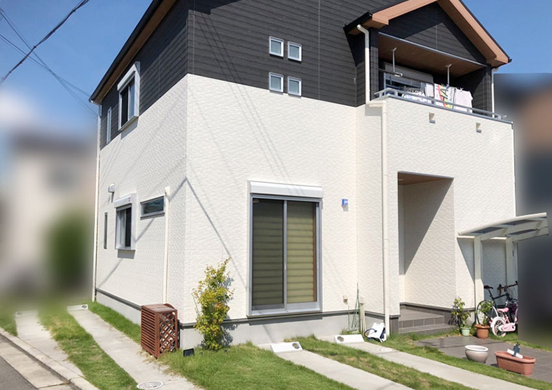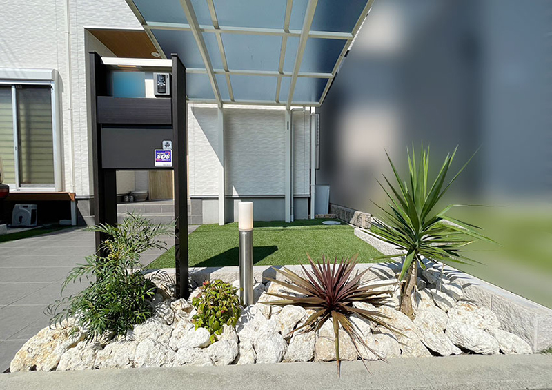 もともとタイヤの乗る部分のみコンクリート、隙間に天然芝を敷いていた駐車場をリフォームしました。角地ならではの使いにくさを解消するため、どちらからでも駐車できるようインターロッキングで隙間を埋め、車が乗らない部分には人工芝を施工。緑を残しつつ、締まりのある雰囲気を実現しました。さらに門柱前にロックガーデンを設け、手入れの少ない植栽や白い石材を組み合わせて爽やかな印象に。使い勝手とデザイン性を両立した駐車場へと生まれ変わりました。